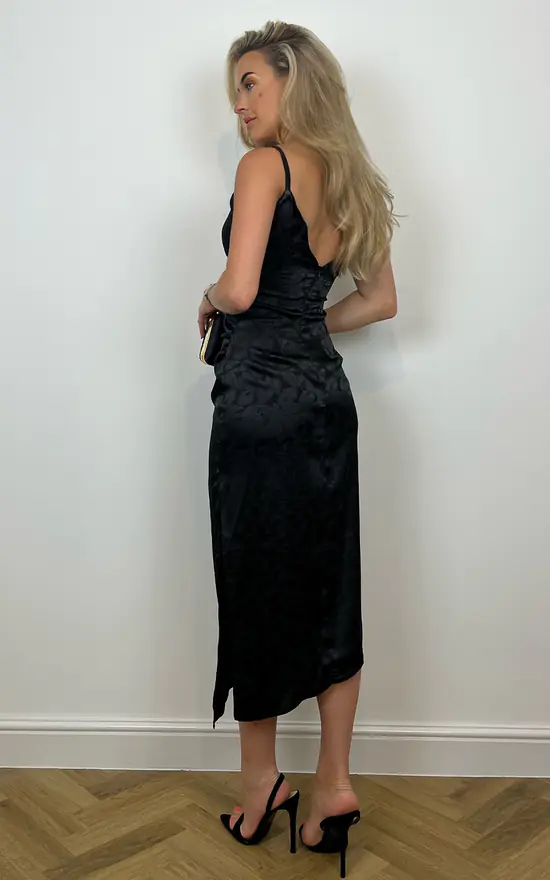 The Vesper Harper Leaf Print Black Strappy Asymetric Midi Dress comes in our new luxe leaf satin jacquard fabric and has a gathered waist detail with asymetric hem and centre back zip fastening. Team with some strappy heels for the perfect out out look.