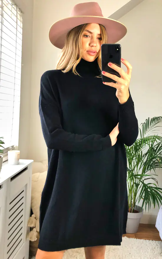 The knit you’ll be wearing all A/W! With a high roll neck and oversized fit, this black knitted tunic is so snug and comfy – you’ll want to wear it everywhere you go.