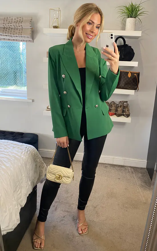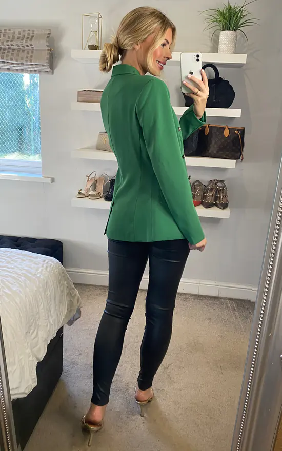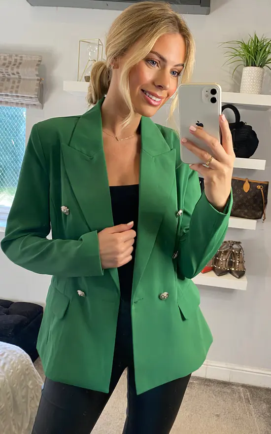 Perfect for all occasions, this s/s essential blazer by Yumi comes in a striking shade of green, features six breast buttons, a striped lining and a tailored fit. Layer over a bodysuit and leather look trousers and match with strappy heels for a super cute smart casual look.