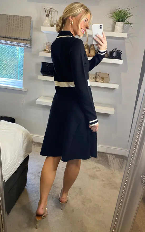 The skater shape, button up collar shape and cinched waist all make this Yumi Black Contrast Collar Knitted Dress a classic fit. In a super soft knit to keep off the chill in the collar months. Style with ankle boots, tights and a blazer to complete the look.